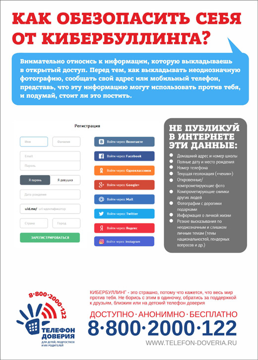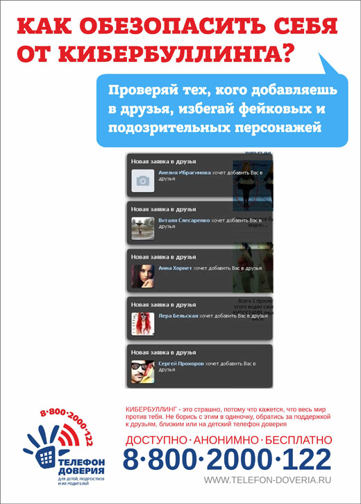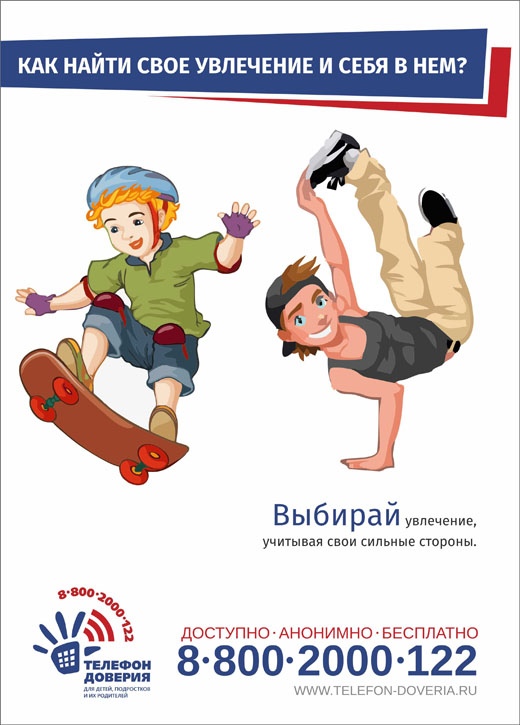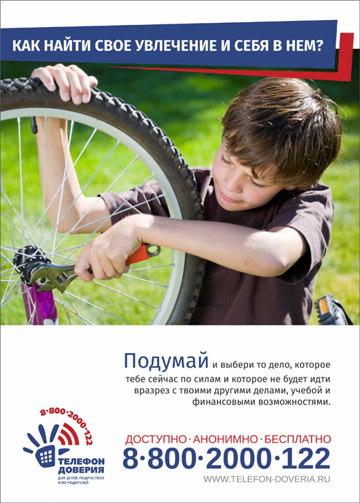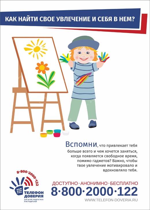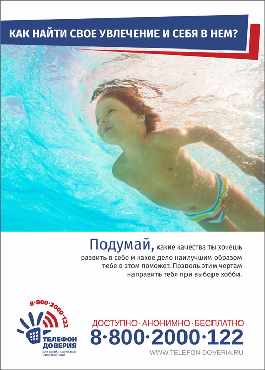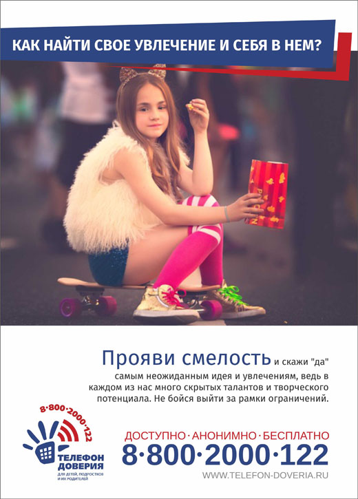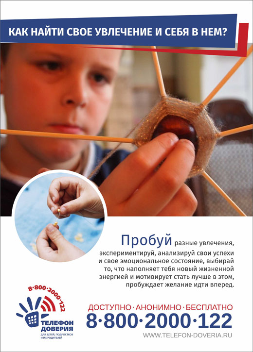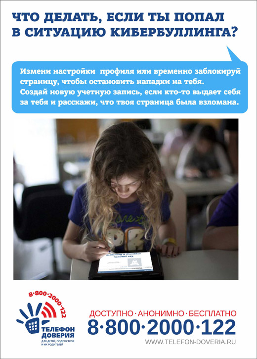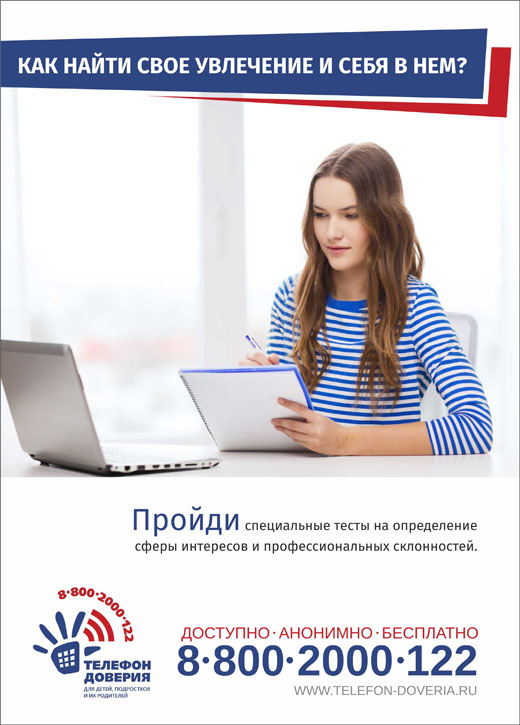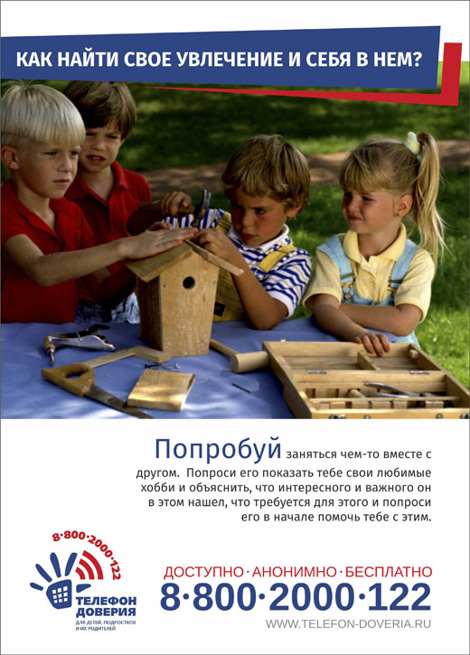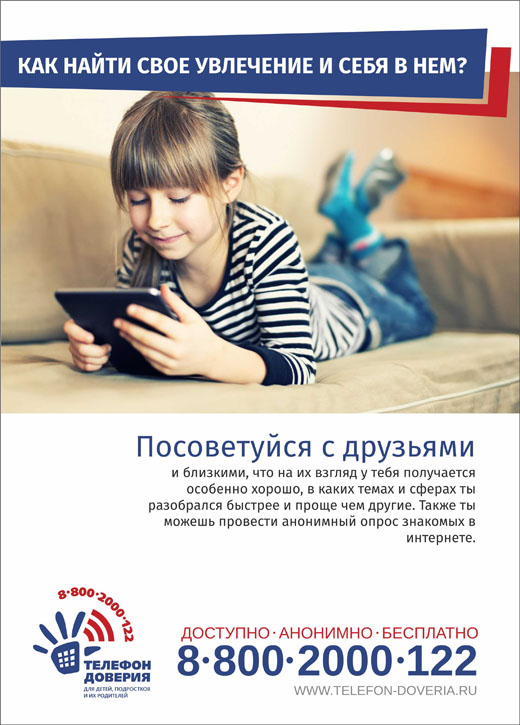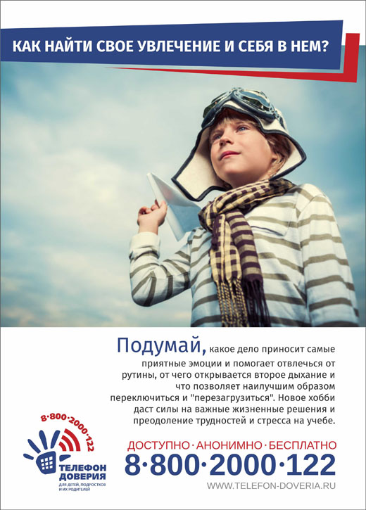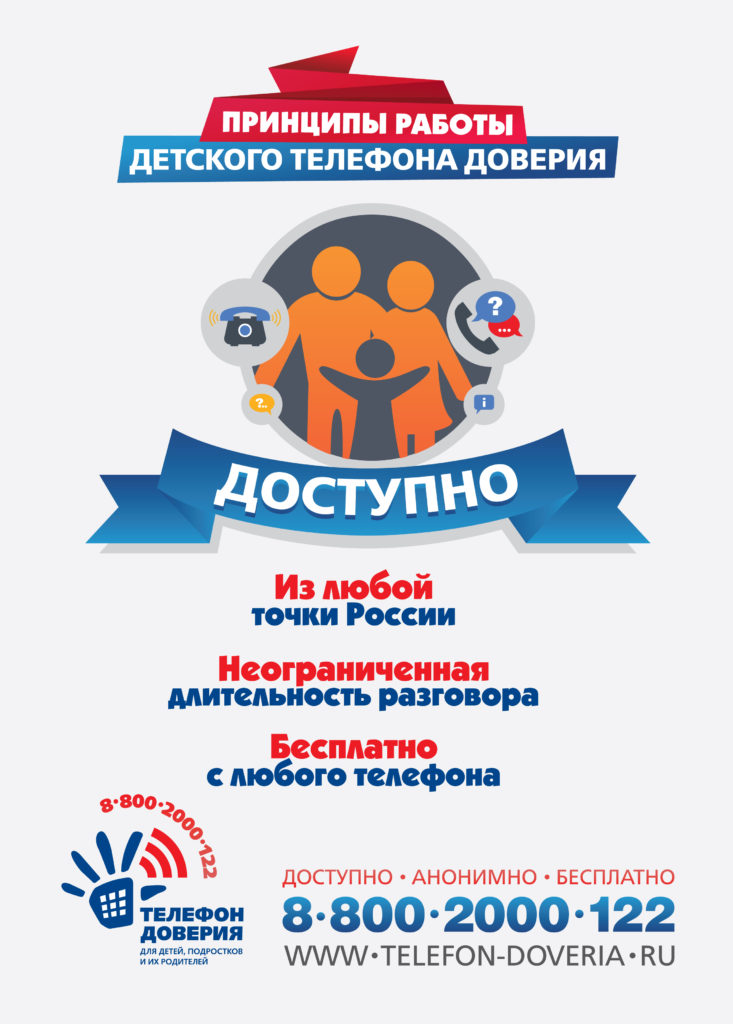 Единый общероссийский детский телефон доверия 8-800-2000-122 для детей, подростков и их родителей создан в 2010 году Фондом поддержки детей, находящихся в трудной жизненной ситуации. Во всех субъектах Российской Федерации специалисты оказывают квалифицированную психологическую помощь. Звонок с любого мобильного и стационарного телефона бесплатный и анонимный. На сегодняшний день к номеру подключено 239 организаций по всей стране. В 65 регионах телефон доверия оказывает помощь своим абонентам в круглосуточном режиме. В 2016 году детский телефон доверия принял шестимиллионный звонок.