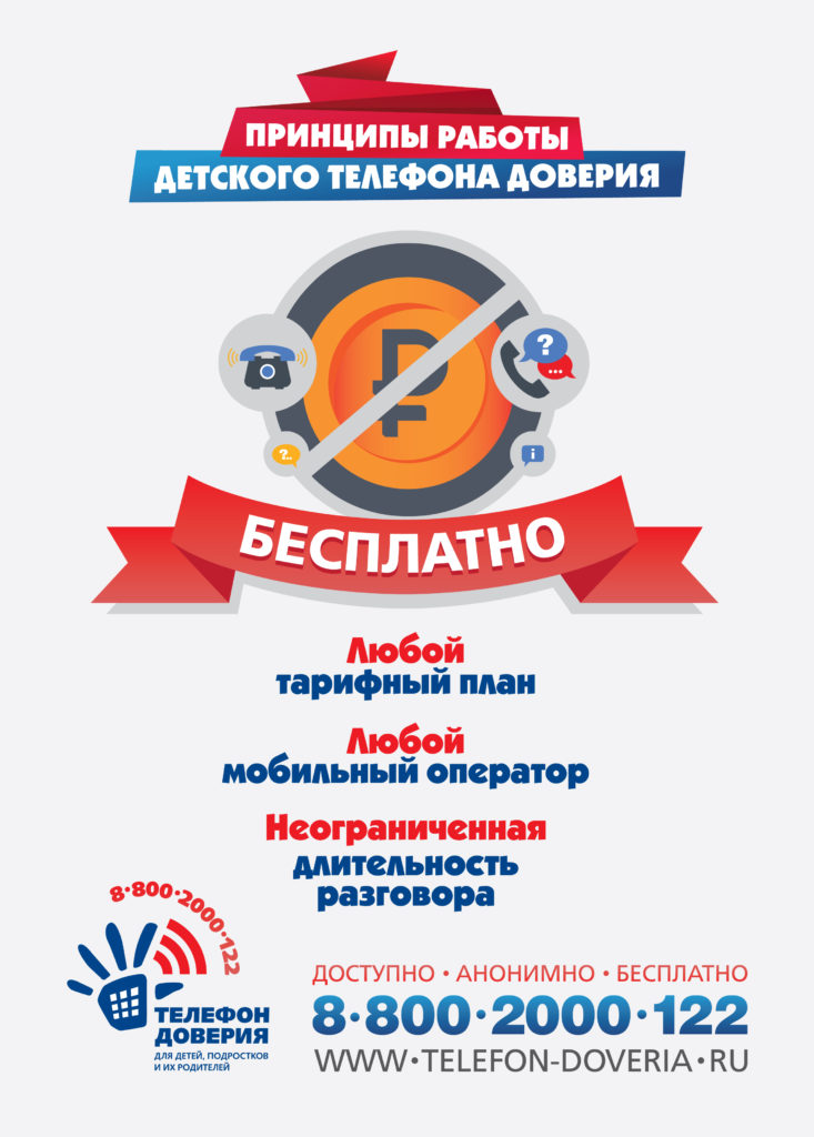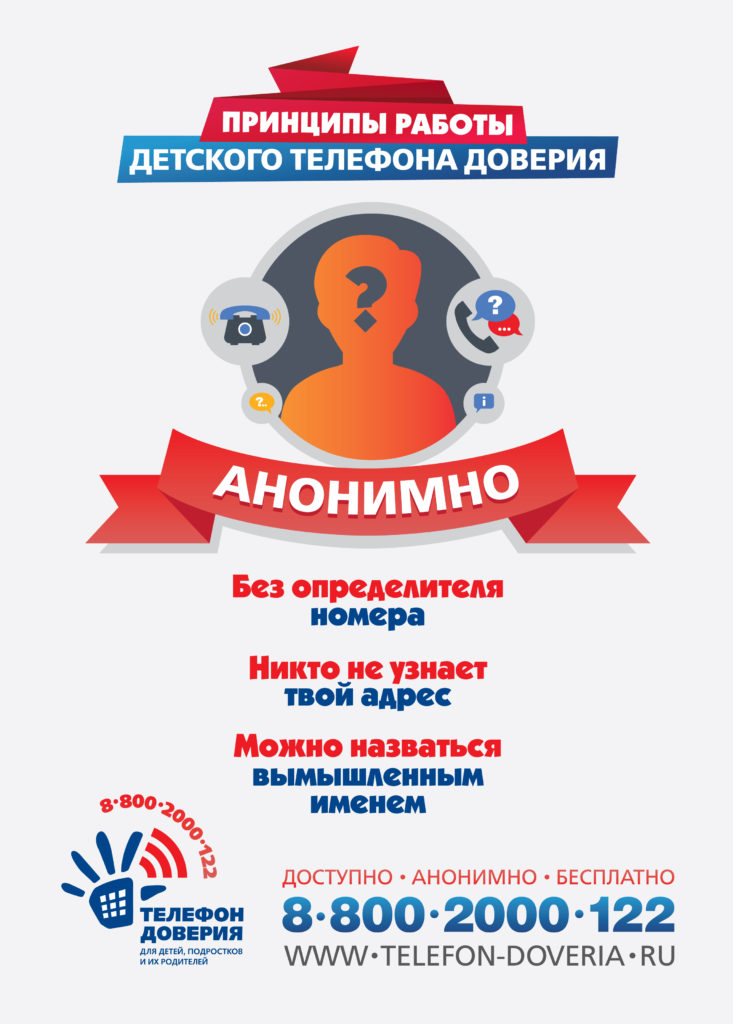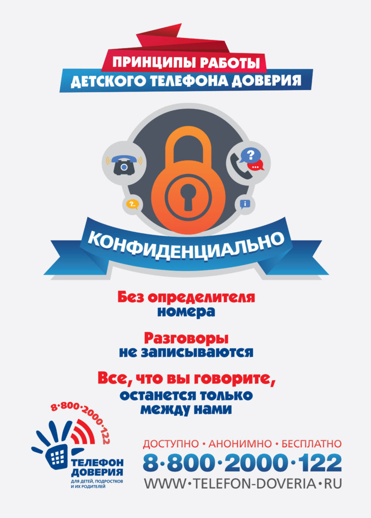 Конфиденциальность и бесплатность — два основных принципа работы детского телефона доверия. Это значит, что каждый ребёнок может анонимно и бесплатно получить психологическую помощь и тайна его обращения на телефон доверия гарантируется.